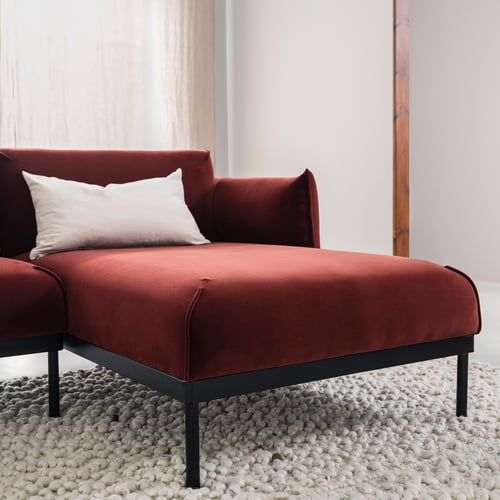 - Care instructionsFrame, non-removable coverWet marks should always be dried off as soon as possible to stop moisture penetration.Remove dust with a lint remover.Light stains can be removed with a sponge damped in water or a mild soapy solution.To make sure that velvet maintains its look and feel, it needs to be cared for regularly according to the care instructions included with the product.Environment and materials3-seat sofaFabric:62% polyester (min. 90% recycled), 38% viscose/rayon3-seat sofaSeat frame:Laminated veneer lumber, Solid wood, Plywood, Particleboard, Highly resilient polyurethane foam (cold foam) 35 kg/cu.m., Fibreboard3-seat sofaPocket spring unit:Steel3-seat sofaUnder frame/ Leg:Steel, Epoxy/polyester powder coating3-seat sofaBackrest cushion:Polyurethane foam 25 kg/cu.m., Highly resilient polyurethane foam (cold foam) 35 kg/cu.m.3-seat sofaClip:Polypropylene plasticChaise longue sectionClip:Polypropylene plasticChaise longue sectionFabric:62% polyester (min. 90% recycled), 38% viscose/rayonChaise longue sectionSeat frame:Laminated veneer lumber, Solid wood, Plywood, Particleboard, Highly resilient polyurethane foam (cold foam) 35 kg/cu.m., FibreboardChaise longue sectionPocket spring unit:SteelChaise longue sectionUnder frame/ Leg:Steel, Epoxy/polyester powder coatingChaise longue sectionBackrest cushion:Polyurethane foam 25 kg/cu.m., Highly resilient polyurethane foam (cold foam) 35 kg/cu.m.