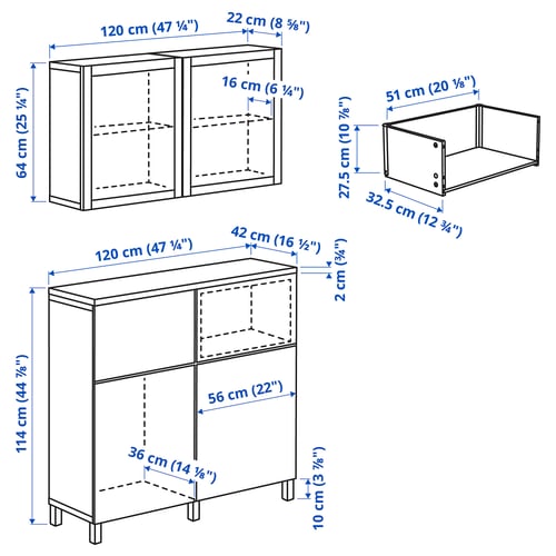 - Product dimensionsWidth120 cmDepth42 cmHeight240 cmPackaging infoThis product comes as 28 packagesBESTÅframe302.459.54Height11 cmLength130 cmNet weight17.06 kgVolume58.1 lWeight18.12 kgWidth41 cmpackage quantity1BESTÅframe902.459.51Height11 cmLength129 cmNet weight14.09 kgVolume55.6 lWeight15.30 kgWidth41 cmpackage quantity1BESTÅframe002.459.60Height6 cmLength69 cmNet weight6.44 kgVolume17.9 lWeight7.18 kgWidth42 cmpackage quantity2BESTÅshelf903.526.82Height2 cmLength59 cmNet weight2.46 kgVolume3.7 lWeight2.50 kgWidth36 cmpackage quantity2BESTÅglass shelf802.955.31Height1 cmLength58 cmNet weight0.90 kgVolume0.5 lWeight0.94 kgWidth18 cmpackage quantity2BESTÅsoft closing/push-open hinge602.612.59Height3 cmLength25 cmNet weight0.25 kgVolume1.3 lWeight0.26 kgWidth20 cmpackage quantity4BESTÅdrawer frame503.513.59Height4 cmLength64 cmNet weight3.72 kgVolume8.7 lWeight4.02 kgWidth34 cmpackage quantity2BESTÅdrawer runner, soft-closing203.487.16Height5 cmLength38 cmNet weight0.95 kgVolume1.1 lWeight1.01 kgWidth5 cmpackage quantity2BESTÅsuspension rail504.883.19Height2 cmLength60 cmNet weight0.55 kgVolume1.0 lWeight0.64 kgWidth7 cmpackage quantity2STUBBARPleg203.527.94Height5 cmLength14 cmNet weight0.38 kgVolume0.7 lWeight0.42 kgWidth10 cmpackage quantity3LAPPVIKENdoor602.916.71Height2 cmLength70 cmNet weight5.02 kgVolume8.8 lWeight5.56 kgWidth60 cmpackage quantity2LAPPVIKENdoor/drawer front202.916.68Height2 cmLength66 cmNet weight3.00 kgVolume5.3 lWeight3.36 kgWidth39 cmpackage quantity2SINDVIKglass door802.963.14Height2 cmLength70 cmNet weight4.15 kgVolume9.3 lWeight4.69 kgWidth60 cmpackage quantity2BESTÅtop panel804.729.20Height3 cmLength130 cmNet weight8.52 kgVolume15.5 lWeight9.06 kgWidth44 cmpackage quantity1