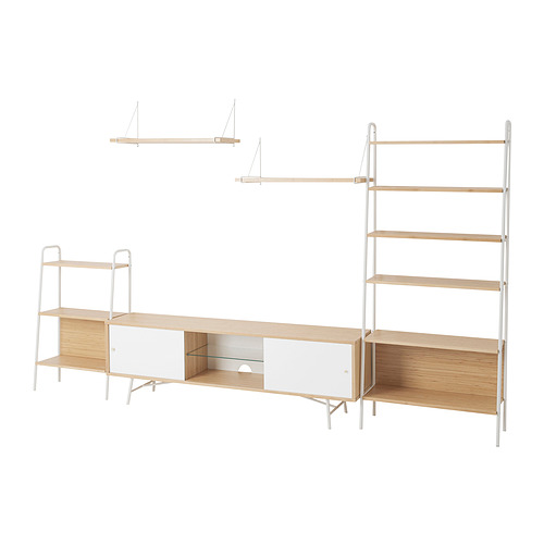 - Care instructionsWipe dry with a clean cloth.Wipe clean with a cloth dampened in water.Environment and materialsCabinet with doorsTop panel/ Stile:Particleboard, Paper foil, Plastic edgingCabinet with doorsTop rail/ Side panel/ Shelf/ Door panel/ Rail/ Bottom panel/ Bottom rail:Particleboard, Paper foilCabinet with doorsBack:Fibreboard, Acrylic paintCabinet with doorsTop/ Stile:Particleboard, Paper foil, Plastic edgingCabinet with doorsBack panel:Fibreboard, Acrylic paintCabinet with doorsSide panel/ Partition/ Bottom rail/ Bottom:Particleboard, Paper foilCabinet with doorsShelf:Particleboard, Tempered glass, Paper foilCabinet with doorsGlass panel:Tempered glassCabinet with doorsRail:Particleboard, Fibreboard, Paper foilTV benchTop panel:Particleboard, Paper foil, Plastic edgingTV benchPartition/ Side panel/ Fixed shelf/ Rail/ Plinth/ Drawer side/ Drawer back:Particleboard, Paper foilTV benchBack/ Drawer bottom:Fibreboard, Paper foilTV benchDrawer front:Tempered glass, Particleboard, Fibreboard, Paper foil, Plastic edging