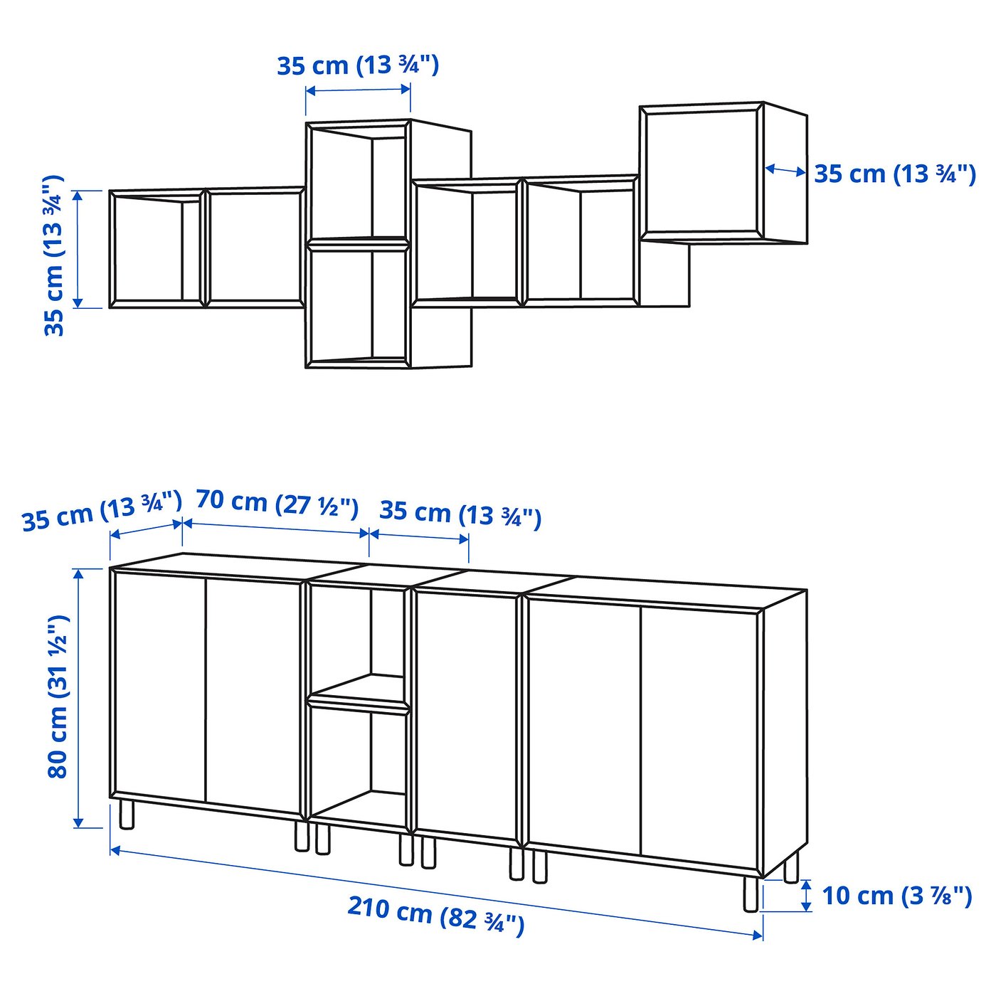 designerIKEA of Sweden- Product dimensionsLength70 cmWidth210 cmDepth35 cmHeight210 cmPackaging infoThis product comes as 24 packagesEKETcabinet w 2 doors and 1 shelf803.339.53Height13 cmLength76 cmNet weight15.55 kgVolume35.8 lWeight16.28 kgWidth36 cmpackage quantity2EKETcabinet w door and 1 shelf703.339.39Height9 cmLength76 cmNet weight9.42 kgVolume25.9 lWeight10.08 kgWidth36 cmpackage quantity1EKETcabinet with door503.321.15Height10 cmLength41 cmNet weight4.70 kgVolume14.0 lWeight5.08 kgWidth36 cmpackage quantity2EKETcabinet003.345.98Height8 cmLength41 cmNet weight3.73 kgVolume11.8 lWeight4.10 kgWidth36 cmpackage quantity4EKETcabinet603.346.04Height8 cmLength41 cmNet weight3.52 kgVolume11.5 lWeight3.84 kgWidth36 cmpackage quantity3EKETsuspension rail603.400.49Height3 cmLength33 cmNet weight0.26 kgVolume0.9 lWeight0.32 kgWidth9 cmpackage quantity7EKETleg604.741.52Height10 cmLength11 cmNet weight0.55 kgVolume1.0 lWeight0.60 kgWidth10 cmpackage quantity4EKETconnection fittings203.346.20Height2 cmLength24 cmNet weight0.15 kgVolume0.9 lWeight0.16 kgWidth18 cmpackage quantity1