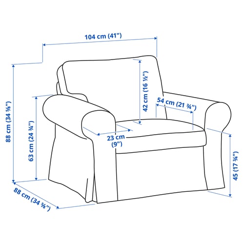 designerIKEA of Sweden- Product dimensionsWidth104 cmDepth88 cmHeight88 cmSeat depth54 cmSeat height45 cmPackaging infoThis product comes as 2 packagesEKTORParmchair frame401.850.54Height39 cmLength126 cmNet weight34.48 kgVolume437.3 lWeight40.25 kgWidth89 cmpackage quantity1EKTORParmchair cover404.398.38Height10 cmLength57 cmNet weight2.94 kgVolume20.8 lWeight3.35 kgWidth37 cmpackage quantity1