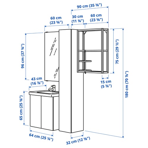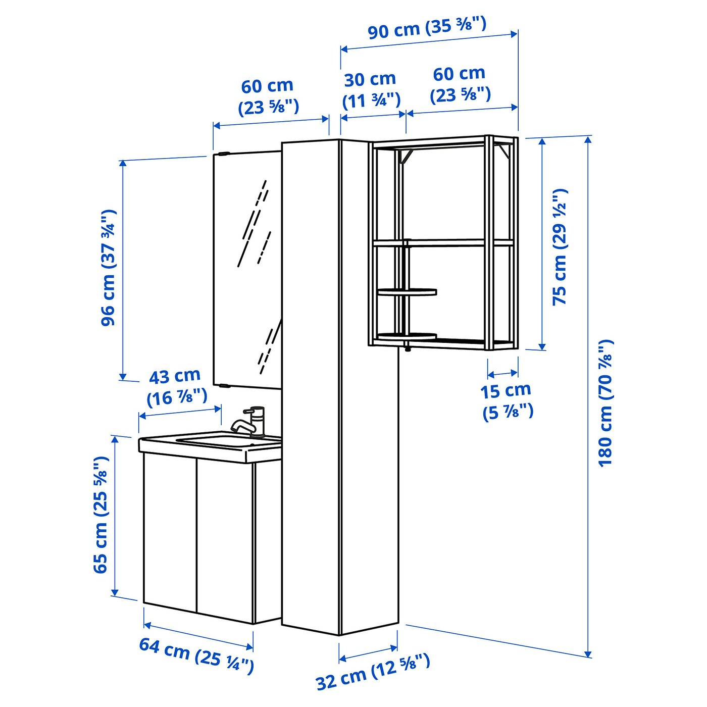 - Product dimensionsWidth64 cmDepth43 cmHeight65 cmPackaging infoThis product comes as 13 packagesENHETdoor304.813.28Height2 cmLength186 cmNet weight6.18 kgVolume11.3 lWeight6.85 kgWidth31 cmpackage quantity1ENHETdoor104.813.29Height2 cmLength66 cmNet weight2.02 kgVolume4.0 lWeight2.26 kgWidth31 cmpackage quantity2ENHETbase cb f washbasin w shelf204.405.88Height14 cmLength68 cmNet weight11.97 kgVolume38.2 lWeight12.77 kgWidth41 cmpackage quantity1ENHEThigh cb w 4 shelves804.406.32Height7 cmLength198 cmNet weight21.46 kgVolume41.6 lWeight22.50 kgWidth31 cmpackage quantity1ENHETswivel shelf204.817.72Height5 cmLength23 cmNet weight0.73 kgVolume2.5 lWeight0.87 kgWidth22 cmpackage quantity1ENHETwall fr w shelves604.816.14Height8 cmLength76 cmNet weight4.88 kgVolume11.6 lWeight5.37 kgWidth20 cmpackage quantity1GUBBARPknob303.364.35Height3 cmLength6 cmNet weight0.02 kgVolume0.1 lWeight0.03 kgWidth6 cmpackage quantity2LETTANmirror604.353.06Height2 cmLength103 cmNet weight5.64 kgVolume17.6 lWeight6.10 kgWidth72 cmpackage quantity1PILKÅNwash-basin mixer tap with strainer604.003.35Height7 cmLength35 cmNet weight0.79 kgVolume5.0 lWeight1.22 kgWidth21 cmpackage quantity1RÄNNILENwater trap, 1 bowl704.224.12Height8 cmLength45 cmNet weight0.45 kgVolume11.6 lWeight0.49 kgWidth35 cmpackage quantity1TVÄLLENsingle wash-basin904.816.36Height20 cmLength68 cmNet weight16.98 kgVolume64.1 lWeight18.60 kgWidth48 cmpackage quantity1