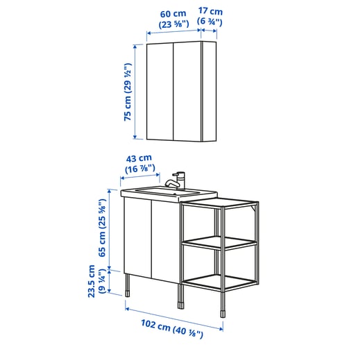 - Product dimensionsWidth102 cmDepth43 cmHeight87 cmPackaging infoThis product comes as 14 packagesENHETdoor404.815.54Height2 cmLength66 cmNet weight2.00 kgVolume4.0 lWeight2.25 kgWidth31 cmpackage quantity2ENHETmirror door304.816.20Height2 cmLength81 cmNet weight3.79 kgVolume5.5 lWeight4.25 kgWidth33 cmpackage quantity2BILLSBROhandle303.236.16Height2 cmLength18 cmNet weight0.02 kgVolume0.4 lWeight0.04 kgWidth12 cmpackage quantity1BILLSBROhandle403.343.13Height2 cmLength18 cmNet weight0.02 kgVolume0.4 lWeight0.04 kgWidth12 cmpackage quantity1ENHETbase cb f washbasin w shelf204.405.88Height14 cmLength68 cmNet weight11.97 kgVolume38.2 lWeight12.77 kgWidth41 cmpackage quantity1ENHETbase fr w shelves804.816.08Height6 cmLength74 cmNet weight5.76 kgVolume19.0 lWeight6.80 kgWidth41 cmpackage quantity1ENHETlegs f cabinet804.816.32Height5 cmLength25 cmNet weight0.43 kgVolume0.7 lWeight0.48 kgWidth6 cmpackage quantity1ENHETlegs f frame804.815.66Height4 cmLength27 cmNet weight0.31 kgVolume0.8 lWeight0.36 kgWidth7 cmpackage quantity1ENHETwall cb w 2 shelves504.406.38Height7 cmLength80 cmNet weight8.01 kgVolume16.1 lWeight8.48 kgWidth31 cmpackage quantity1PILKÅNwash-basin mixer tap with strainer604.003.35Height7 cmLength35 cmNet weight0.79 kgVolume5.0 lWeight1.22 kgWidth21 cmpackage quantity1RÄNNILENwater trap, 1 bowl704.224.12Height8 cmLength45 cmNet weight0.45 kgVolume11.6 lWeight0.49 kgWidth35 cmpackage quantity1TVÄLLENsingle wash-basin904.816.36Height20 cmLength68 cmNet weight16.98 kgVolume64.1 lWeight18.60 kgWidth48 cmpackage quantity1