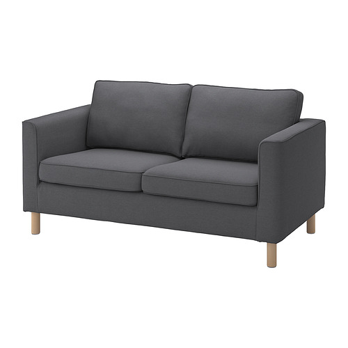 - Care instructionsDo not wash.Do not bleach.Do not tumble dry.Do not iron.Do not dryclean.Vacuum clean.Environment and materials2-seat sofa frameBack and seat frame:Plywood, Particleboard, Solid wood, Fibreboard2-seat sofa frameArmrest frame:Plywood, Particleboard, Polyurethane foam 25 kg/cu.m., Solid wood, Fibreboard2-seat sofa frameBack cushion:Polyurethane foam 25 kg/cu.m.2-seat sofa frameSeat cushion:Highly resilient polyurethane foam (cold foam) 35 kg/cu.m.2-seat sofa frameFabric:100% polyester (min. 90% recycled)LegSteel, Chrome-plated