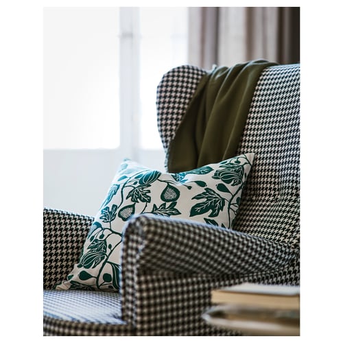 - Care instructionsFrame, non-removable coverVacuum clean.Wipe clean with a damp cloth.Cushion coverDo not wash.Do not bleach.Do not tumble dry.Do not iron.Do not dryclean.Environment and materialsFabric:100% cottonFrame:Plywood, Particleboard, Solid woodSeat cushion:Polyurethane foam 35 kg/cu.m.Leg:Solid wood, Tinted clear lacquer