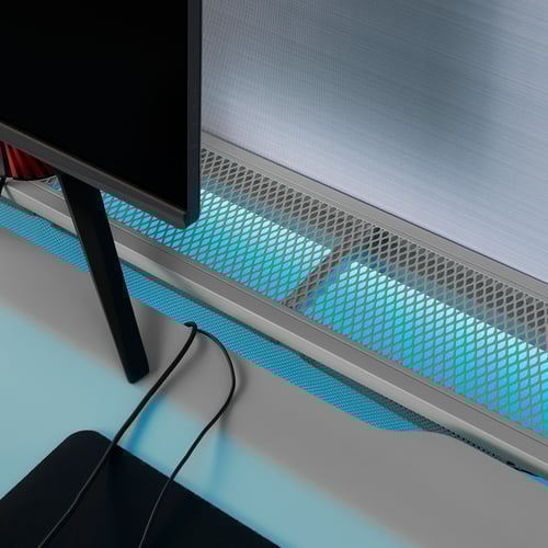 The metal mesh at the back of the desk allows air through that cools your PC and is so sturdy that you can even clamp a pair of monitor arms to it.
