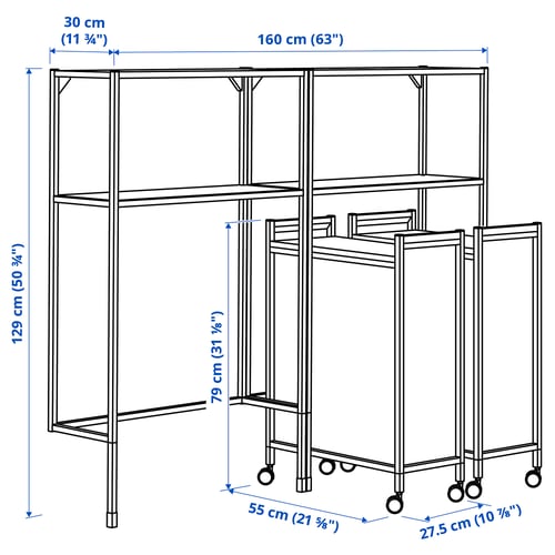 包含带洗衣机搁板的框架、附脚轮洗衣袋和挂钩。
